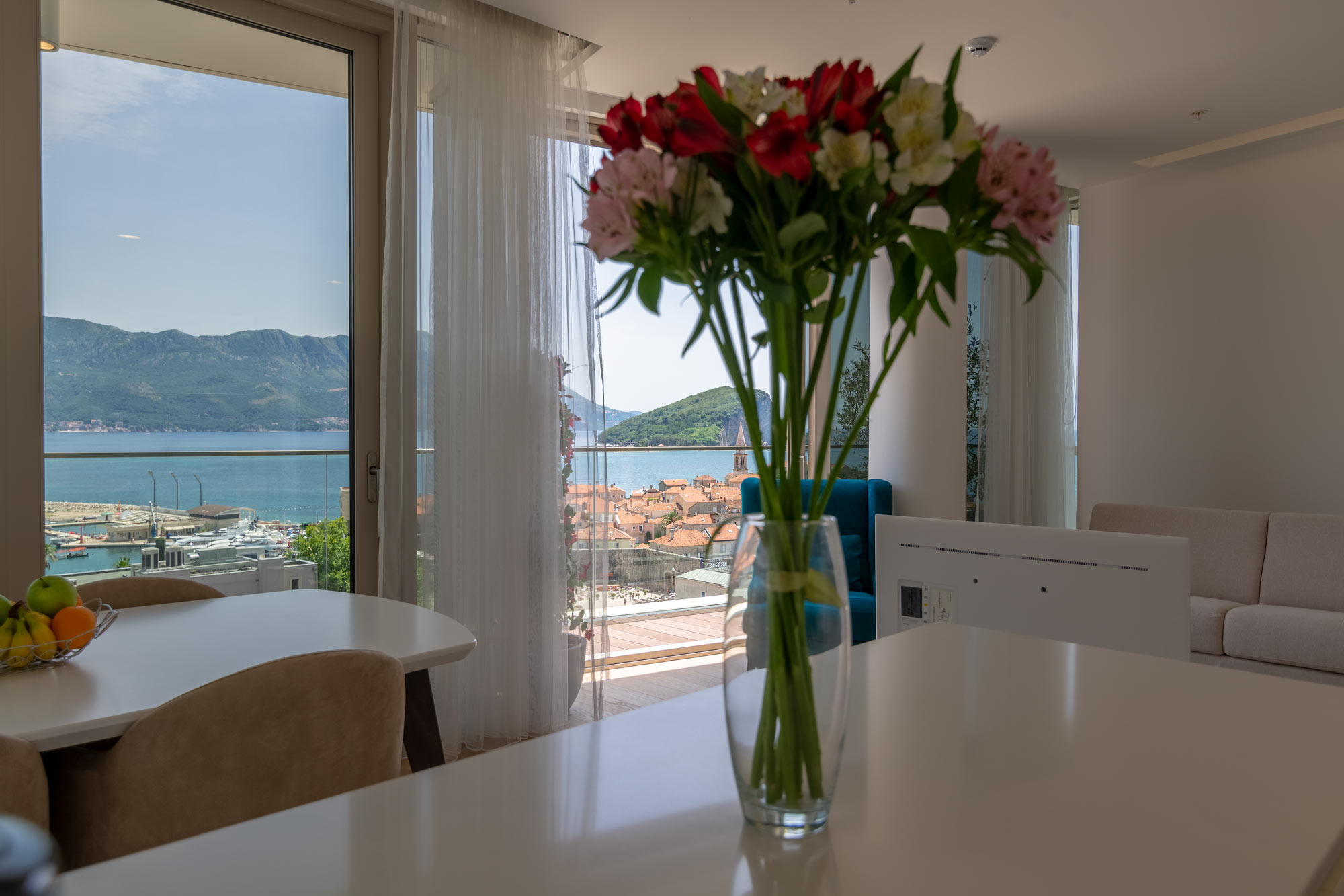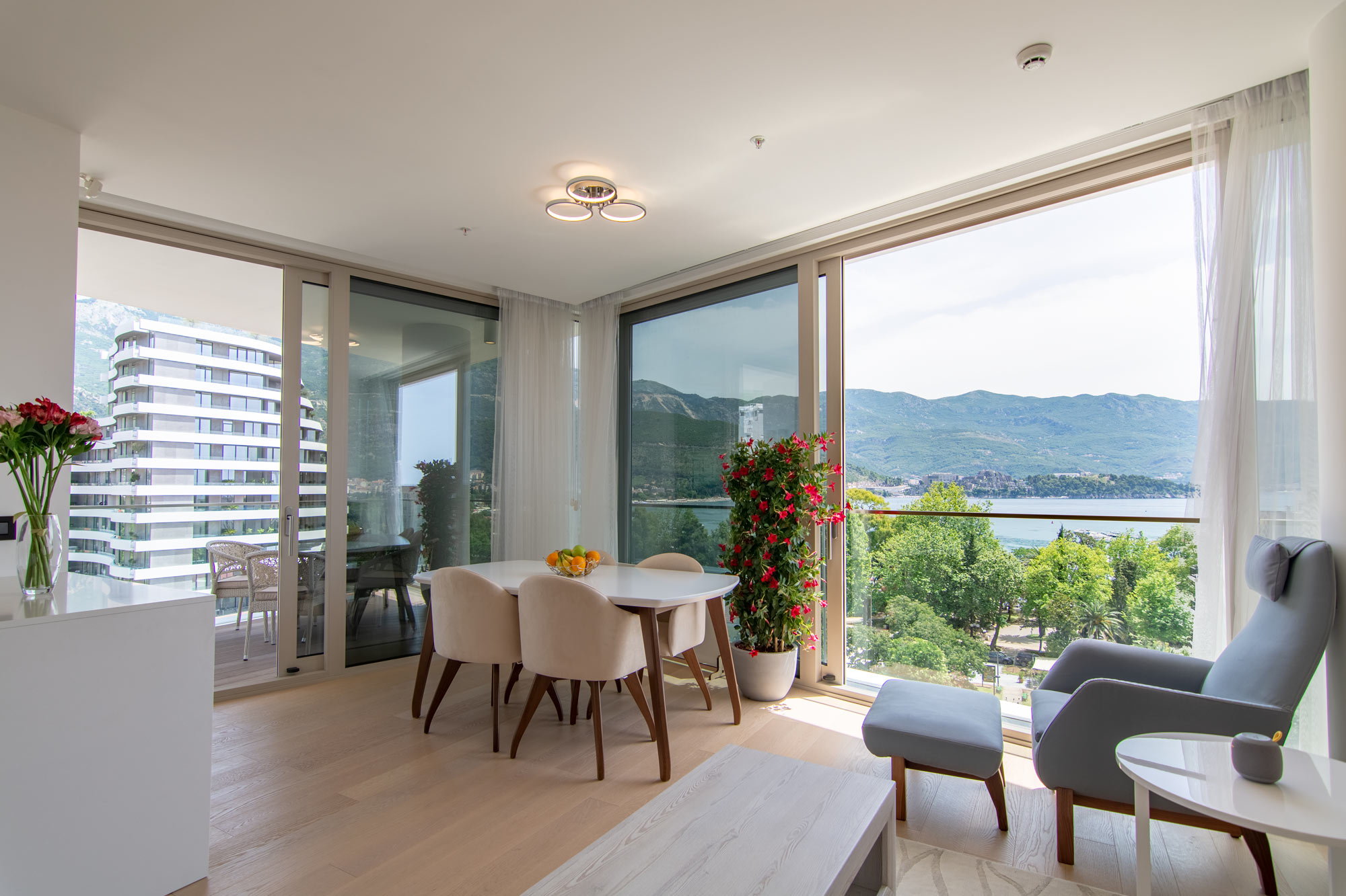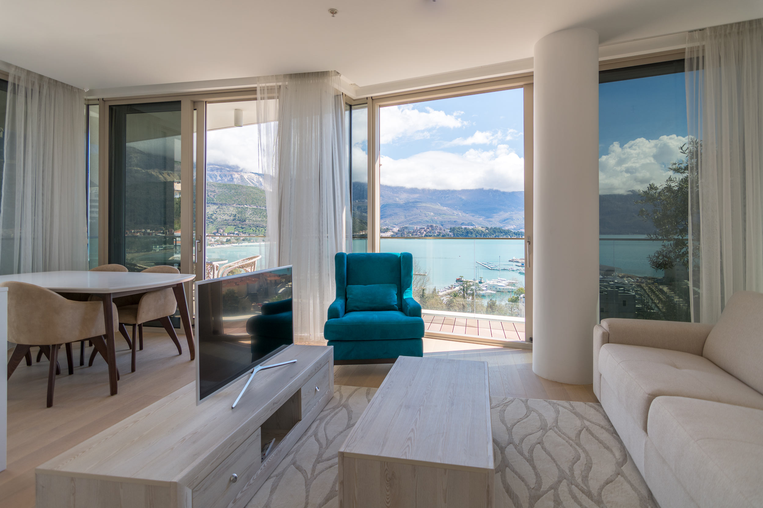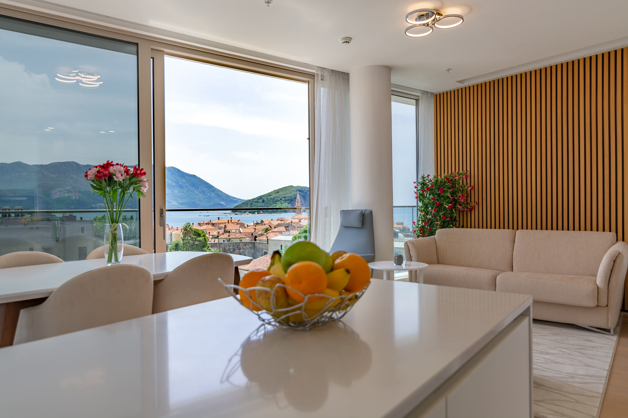 Огромные панорамные окна наполняют помещение воздухом и солнечным светом, позволяя вам любоваться вдохновляющими видами Черногории с утра до самого вечера.