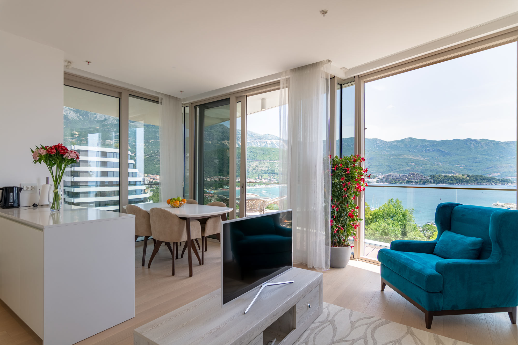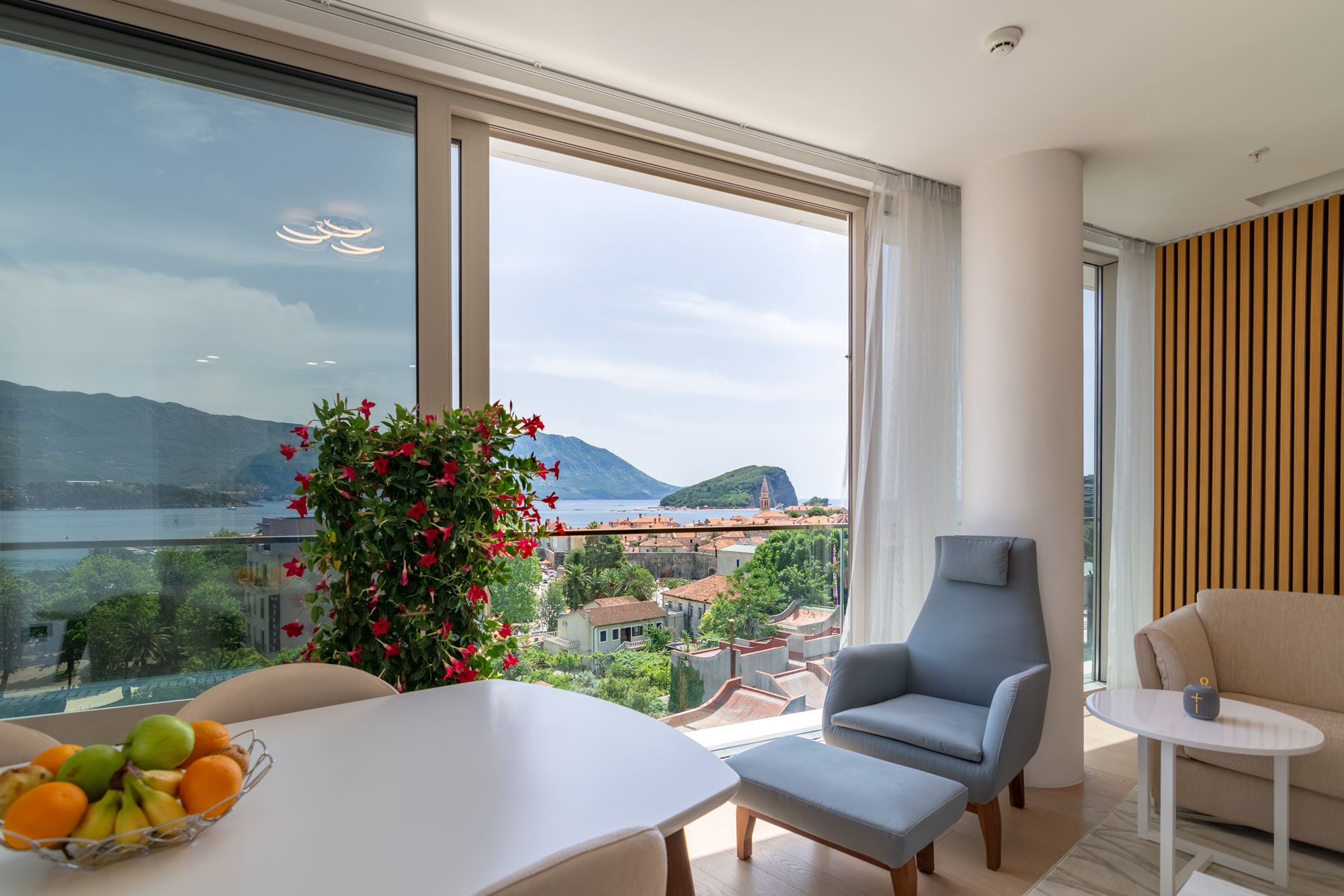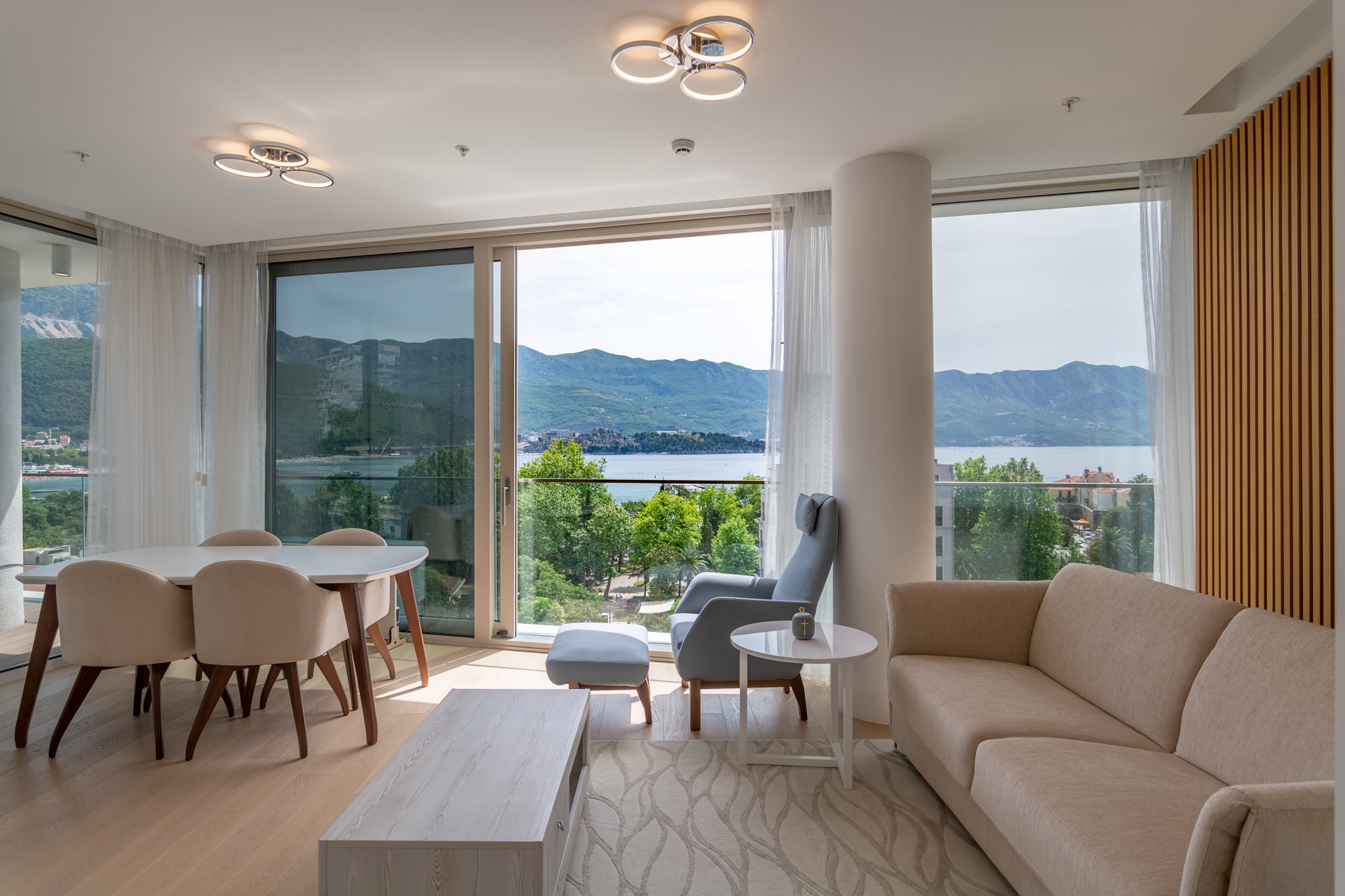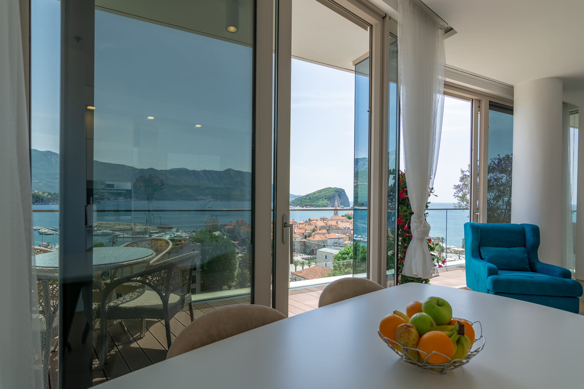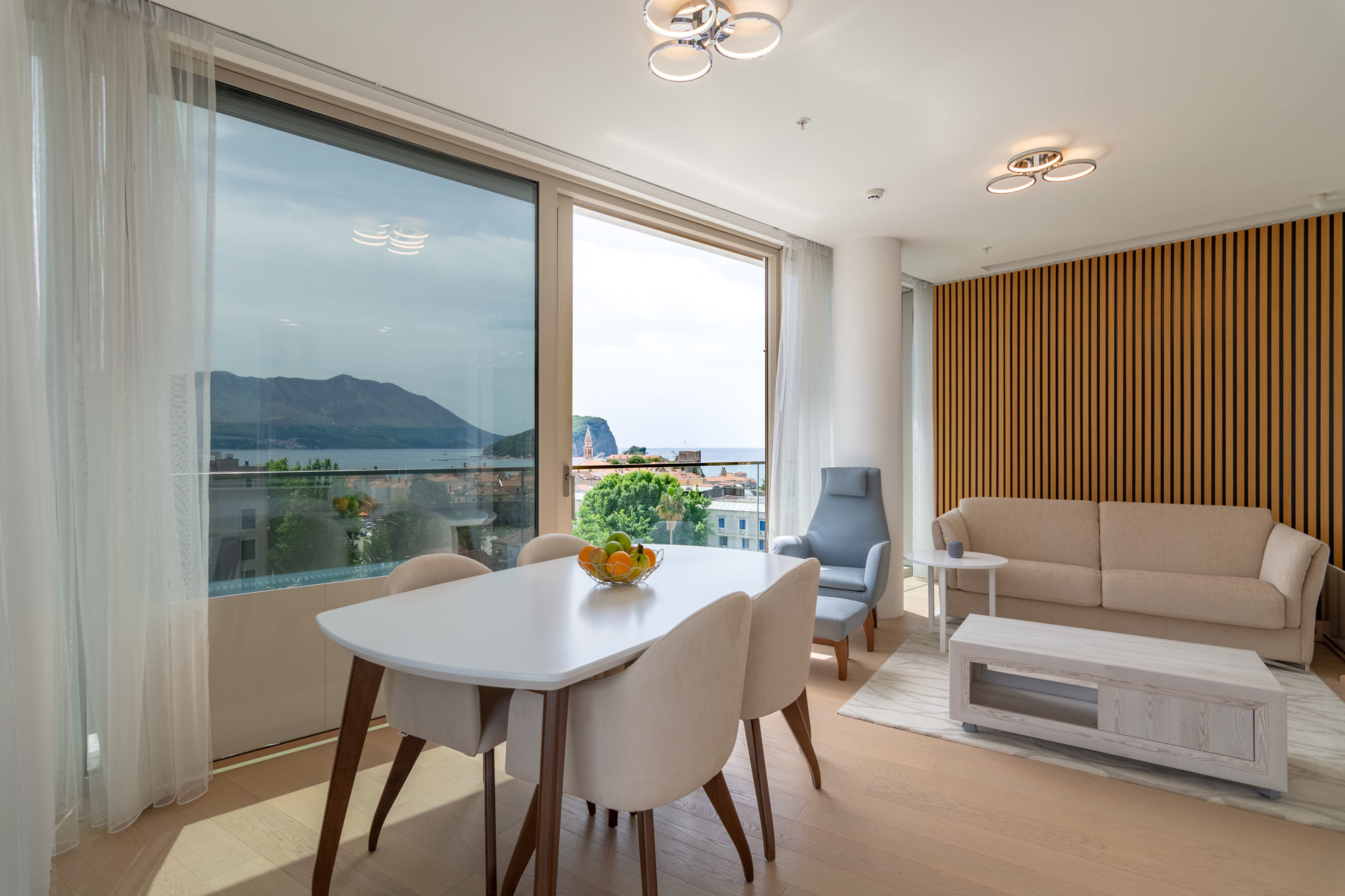 Огромные панорамные окна наполняют помещение воздухом и солнечным светом, позволяя вам любоваться вдохновляющими видами Черногории с утра до самого вечера.